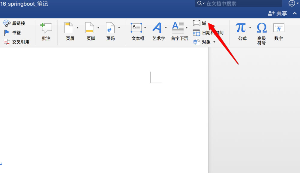 将光标定位在要显示Word总页数的位置,切换到【插入】选项卡,在选项卡中可以找到【域】