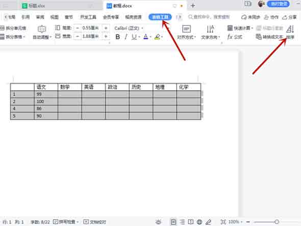 第一步:点击表格后,在表格工具里点击排序。