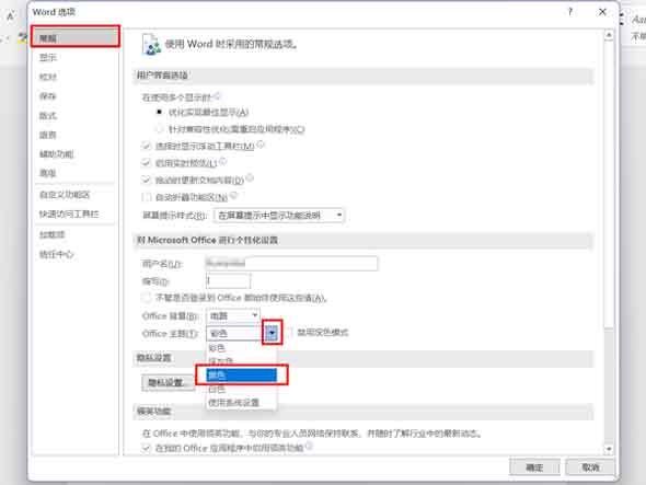3、从常规版块中找到office主题,设置为黑色就可以了。