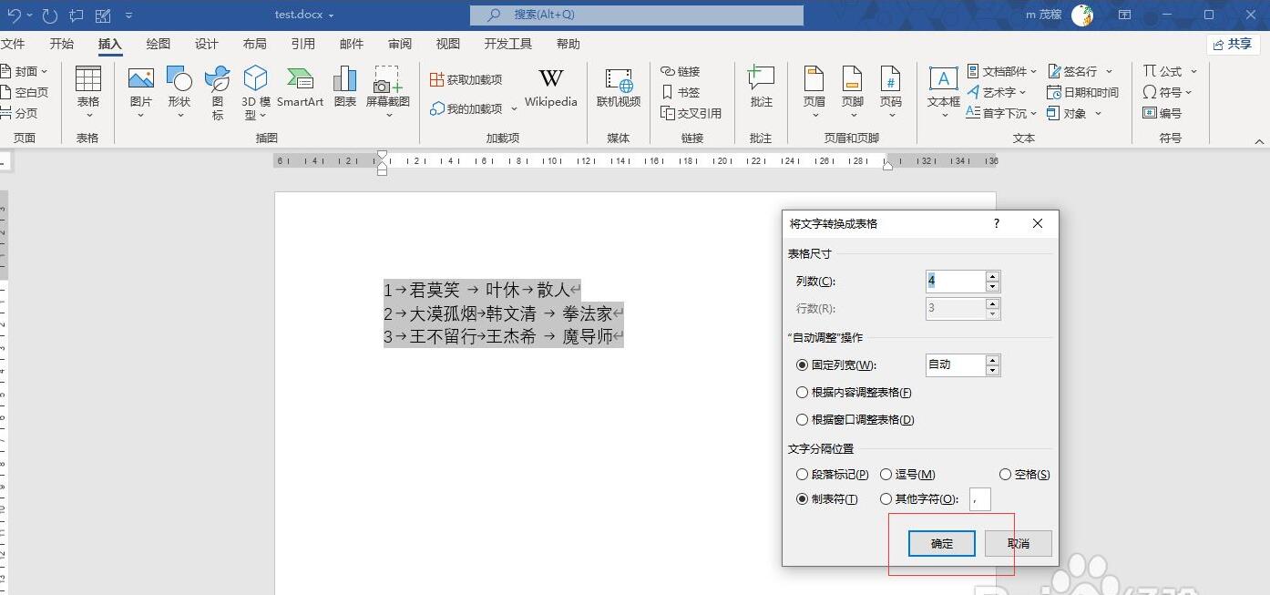 弹出"将文字转换成表格"面板,点击"确定"。