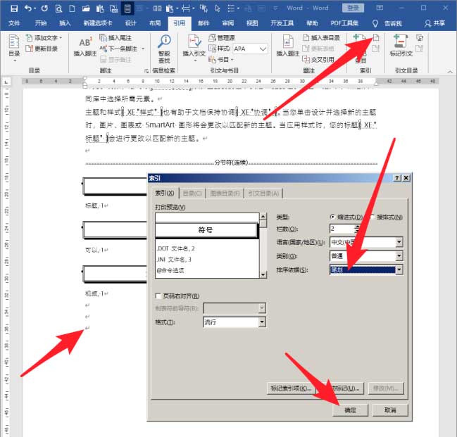 不做其他任何更改,在新的段落位置,同样执行插入索引,其他项目保持相同,【排序依据】选择【笔划】,点击【确定】。