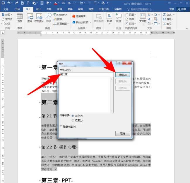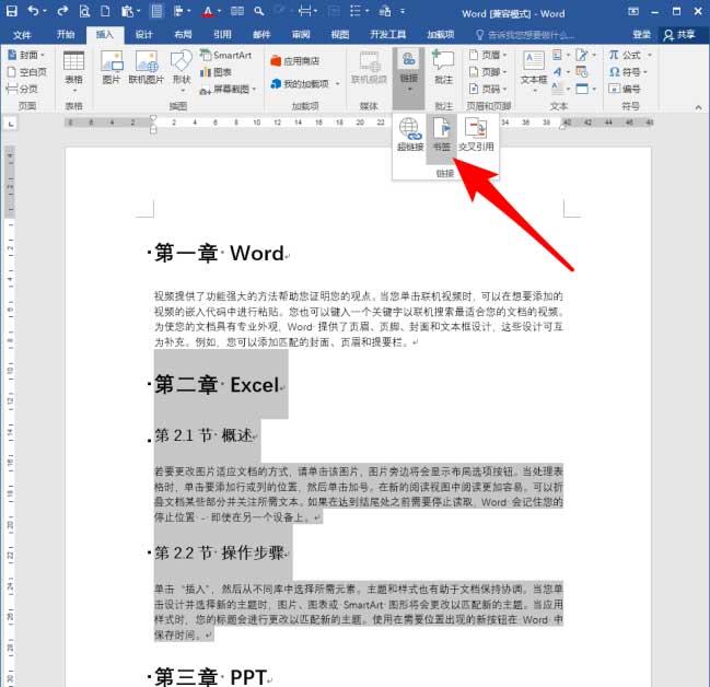 选中第二章的全部内容,点击【插入】【链接】【书签】。