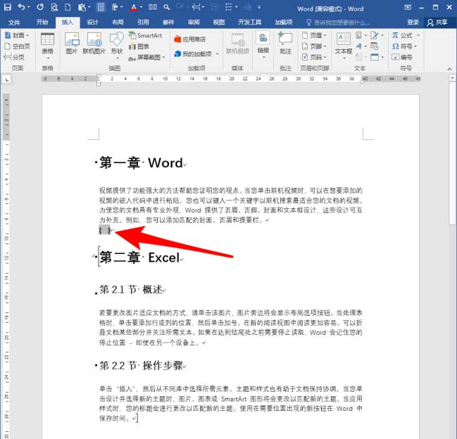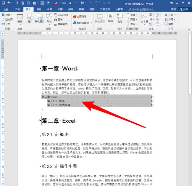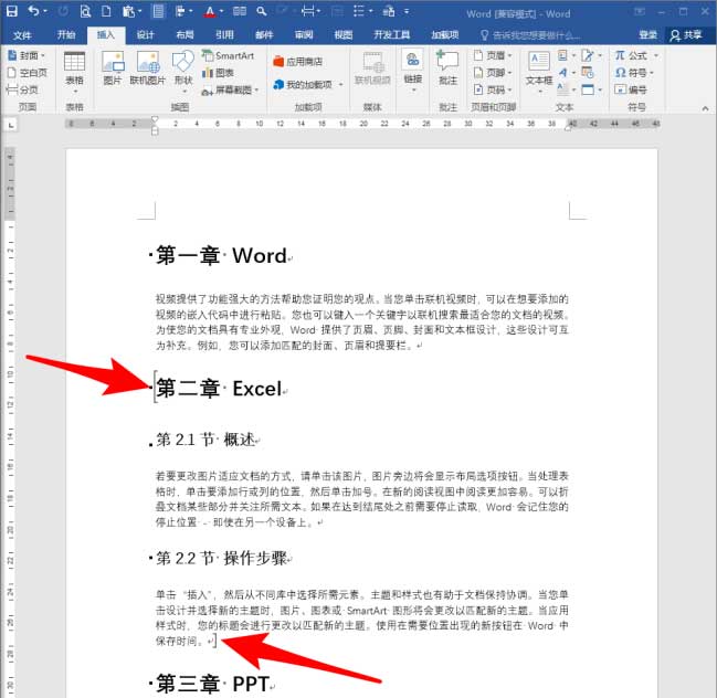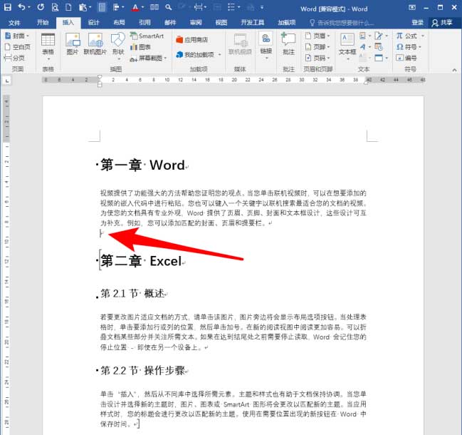 章目录一般位于本章正文的前方,所以,在章标题前方按回车键,插入一个空段落。