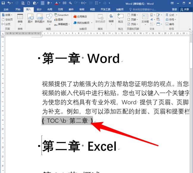在域中输入【TOC b 第二章】。
