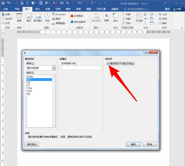 在打开的【域】设置窗口中,类别选择【索引和目录】,再选择其中的RD域。