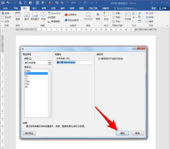 进入到总目录文档中,点击【插入】【文档部件】【域】。