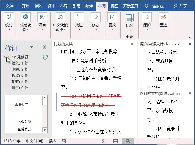2、在这里,我们可以清晰的看到"比较的文档"中修改痕迹,左侧还会显示修订数量与类型。