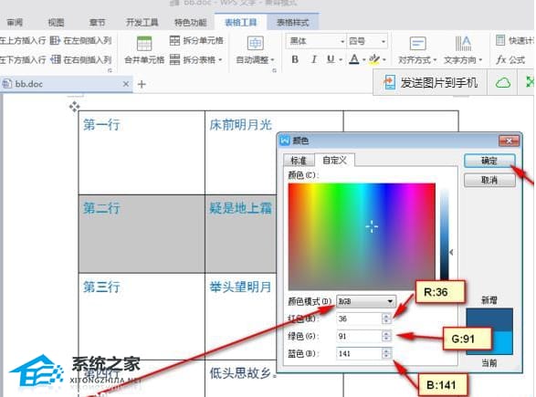 5、在弹出的对话窗口里,选择"自定义",看到"颜色样式RGB"设置下面的颜色"红色R:36","绿色G:91","蓝色B:141",点击"确定"按钮就可以了。