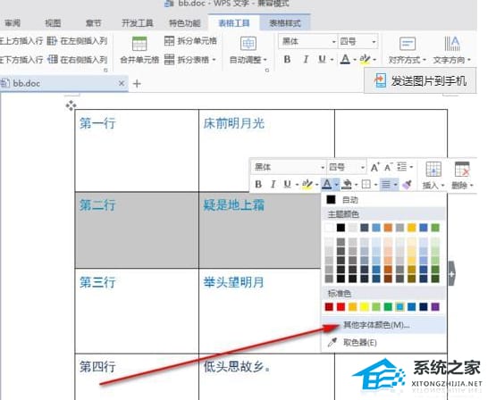 4、选中第二行的字体,右键在"A"的右边有一个下箭头,点击,弹出下拉列框,点击"其他字体颜色"