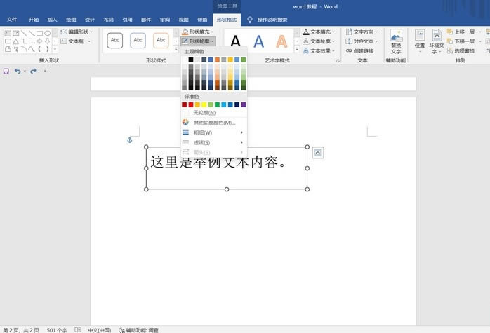 第一步:打开Word文档,点击选中文本框,接着点击界面上方新出现的"形状格式",在"形状样式"栏点击"形状轮廓",在其下拉选项中点击选择"无轮廓";