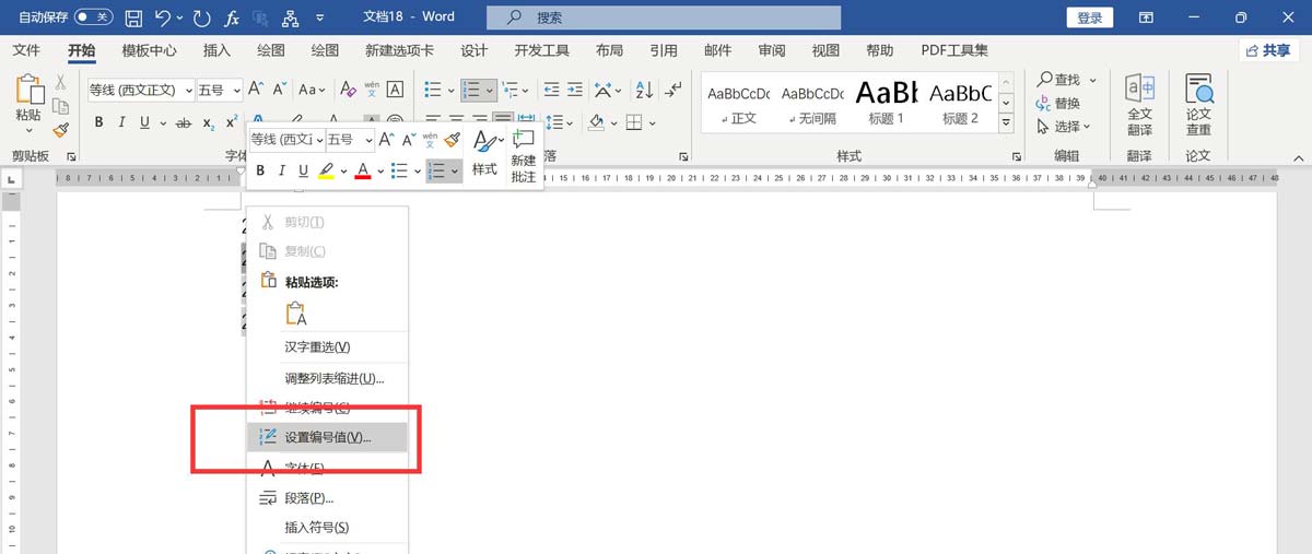 点击鼠标右键,选择"设置编号数值"。