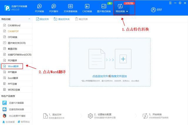 首先,下载安装PDF转换器,打开之后点击最上方工具栏中右侧的【特色转换】,点击左边【特色功能】中的【Word翻译】。