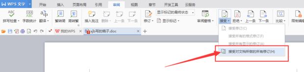 在页面中找到"接受"选项,点击此选项的下拉按钮,可以看到唯一的选项"接受对文档所做的所有修改",点击后选择保存文档即可永久去掉WORD修改痕迹。
