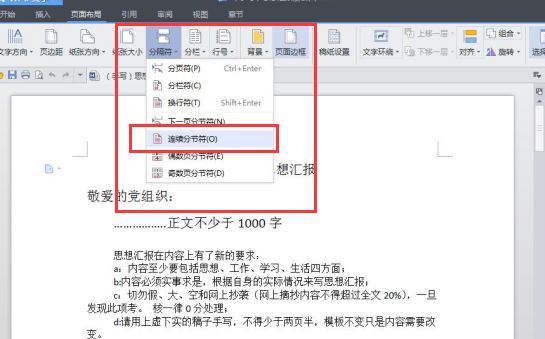 在弹出的菜单中,选择"连续分节符"。
