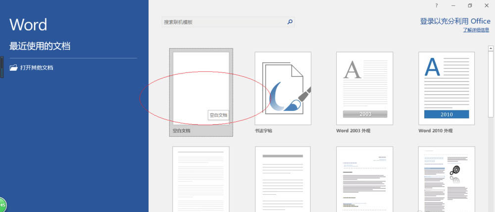 1、启动Word 2016文字处理应用软件,如图所示点击屏幕右侧新建空白文档。