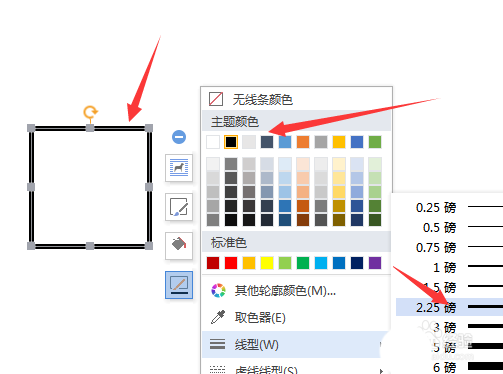 1、打开文档,使用【插入】——【形状】——【矩形】画一个正方形,并设置轮廓线为【黑色】,线型为【2.25磅】,填充色为【无色】或者【白色】。如下图所示。