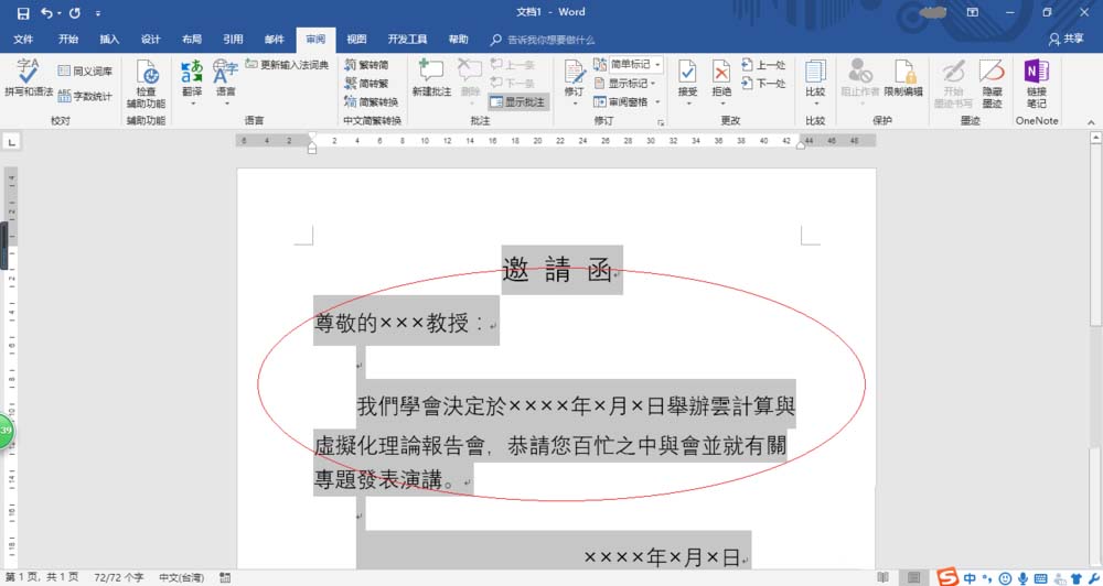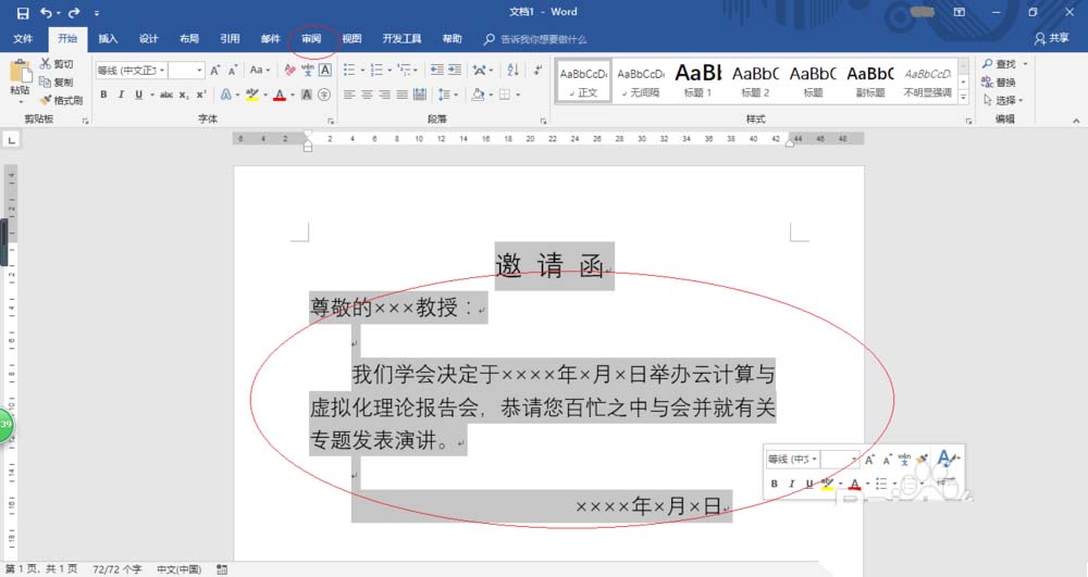 3、如图所示,全选邀请函文档内容。选择功能区"审阅"标签,下步将进行繁体邀请函的制作。