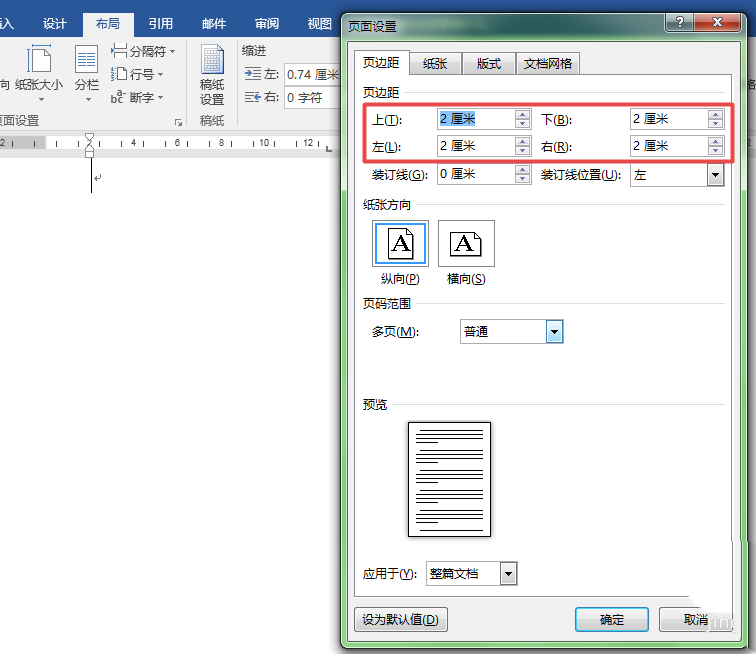 1、首先设置页边距,将上下左右全部改为2,文档网格指定为无网格。