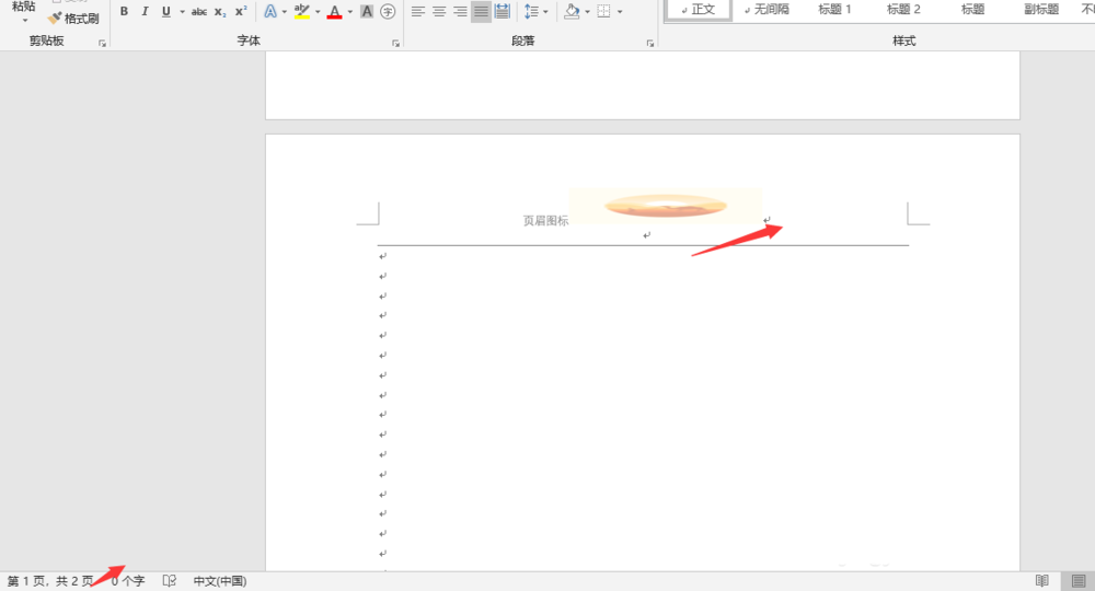 6、插入页面图标与文字完成后,切换到文档的第二页可以看到页眉是自动传递的。