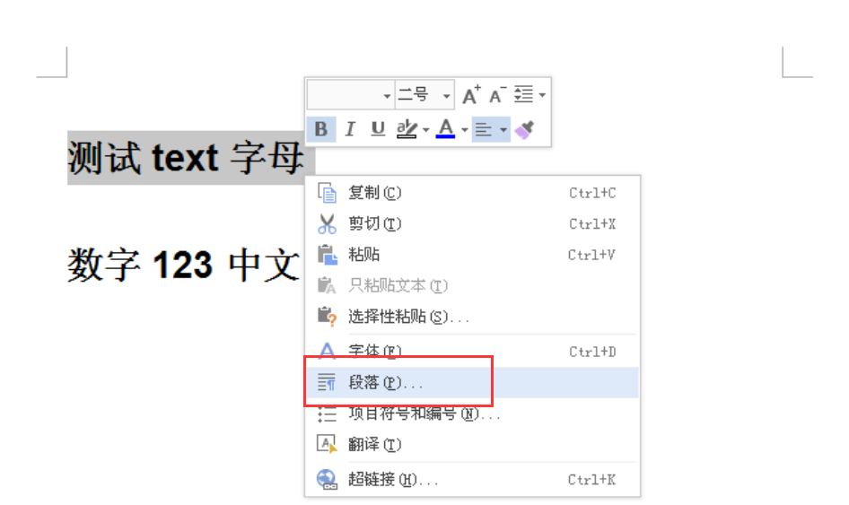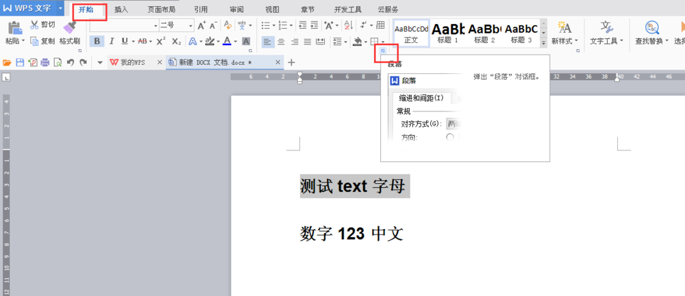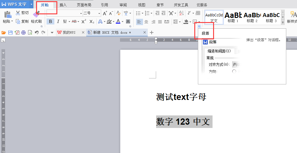 5、同理,框选第二行的中文+数字,然后点击段落以打开段落设置对话框