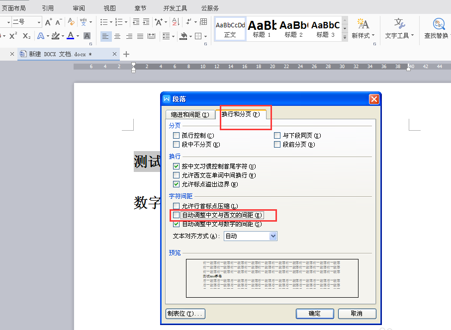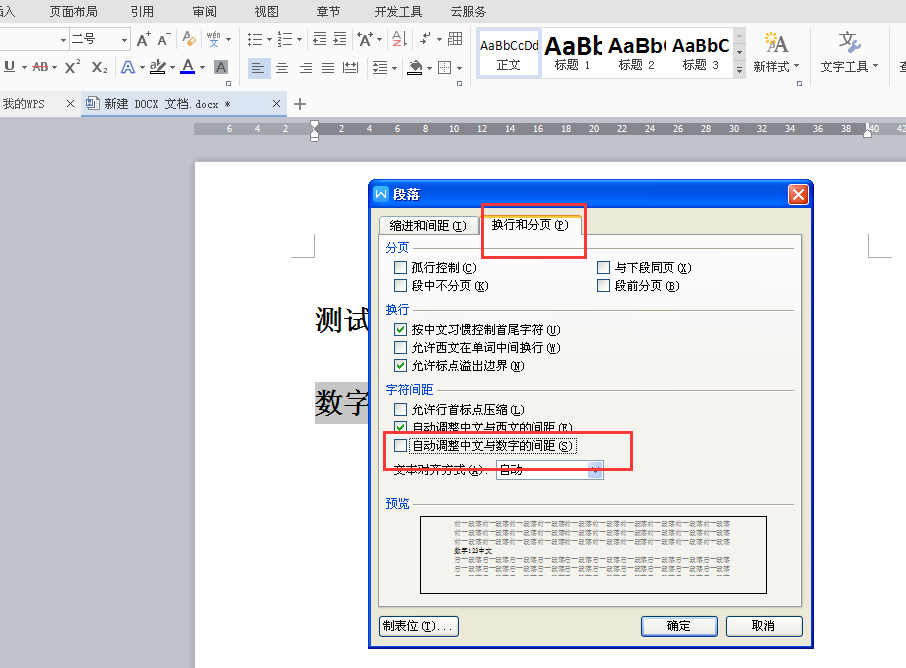 6、在弹出的"段落"对话框中选择换页与分行项,将"自动调整中文与数字的间距"选项前的勾选去掉,然后确定