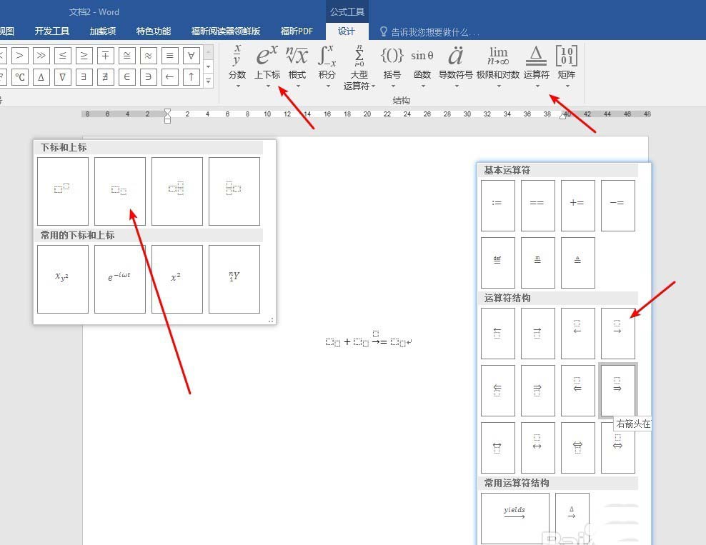 3、以氢气和氧气燃烧的化学方程式为例,先分别点击"上下标"、"运算符"等,把方程式的框架列出。