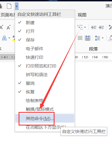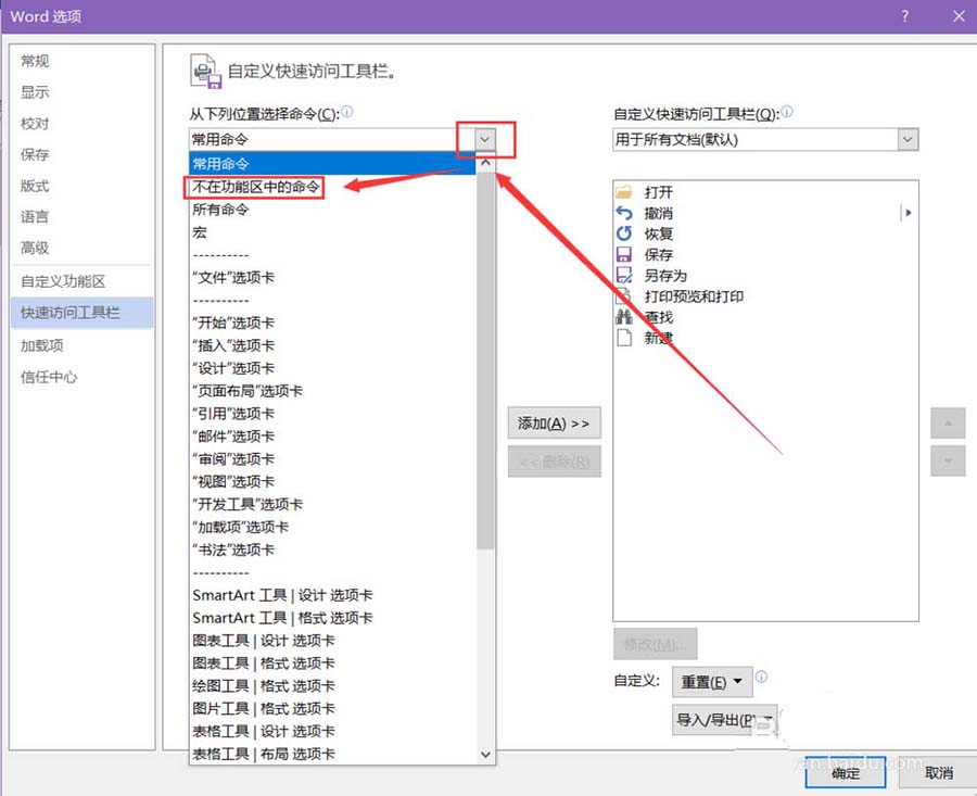 3、在"从下列位置选择命令"列表框中选择"不在功能区中的命令"。