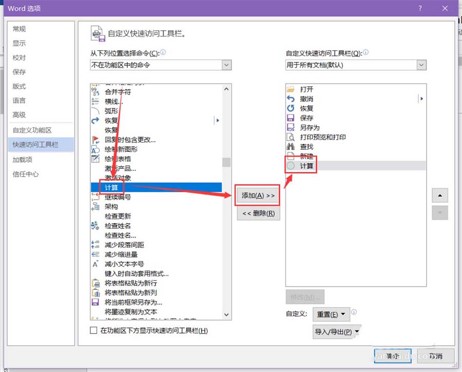4、在下面找到"计算",然后点击"添加",点击确定,这个功能就被添加到快速访问工具栏了。