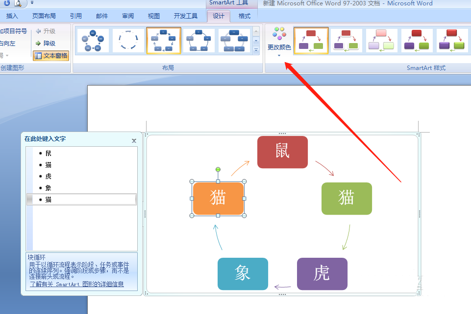 7、在"更改颜色"栏目里,我们可以更换图形的样式,使得制作的作品更为美观。
