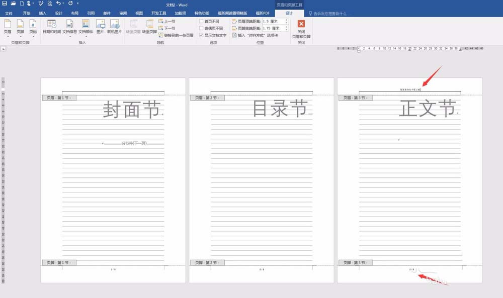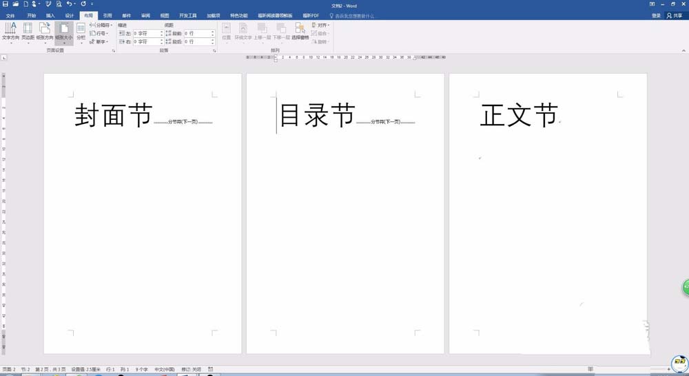 1、建立空白文档,插入多个节:封面、目录、正文。