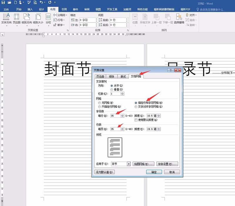 3、设置文档网格,指定每一页的行数和每一行的字数。