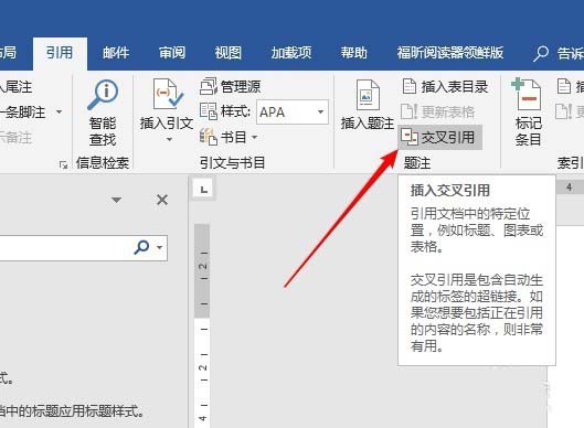 4、光标置于适当的位置,点击"引用"—"交叉引用"。