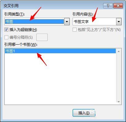 5、在打开的窗口中,"引用类型"选择"书签","引用内容"选择"书签文字","引用哪一个书签"点选刚才插入的书签。