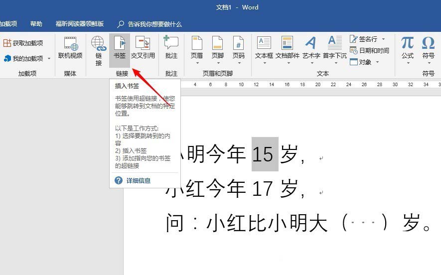 2、选中数字"15",点击"插入"—"书签"。