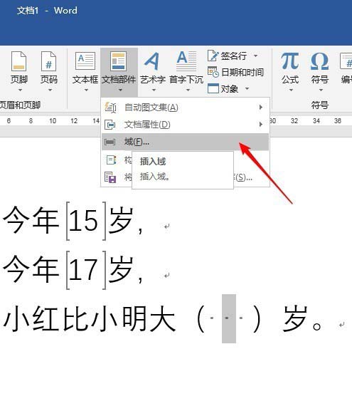 5、回到正文,将光标置于()内,点击"插入"—"文档部件"—"域"。