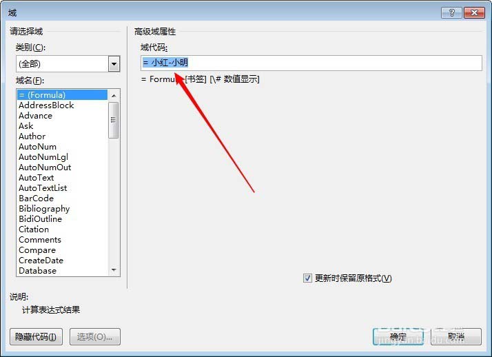 7、在右侧"域代码"中输入= 小红-小明。(也就是之前插入的书签的名称)