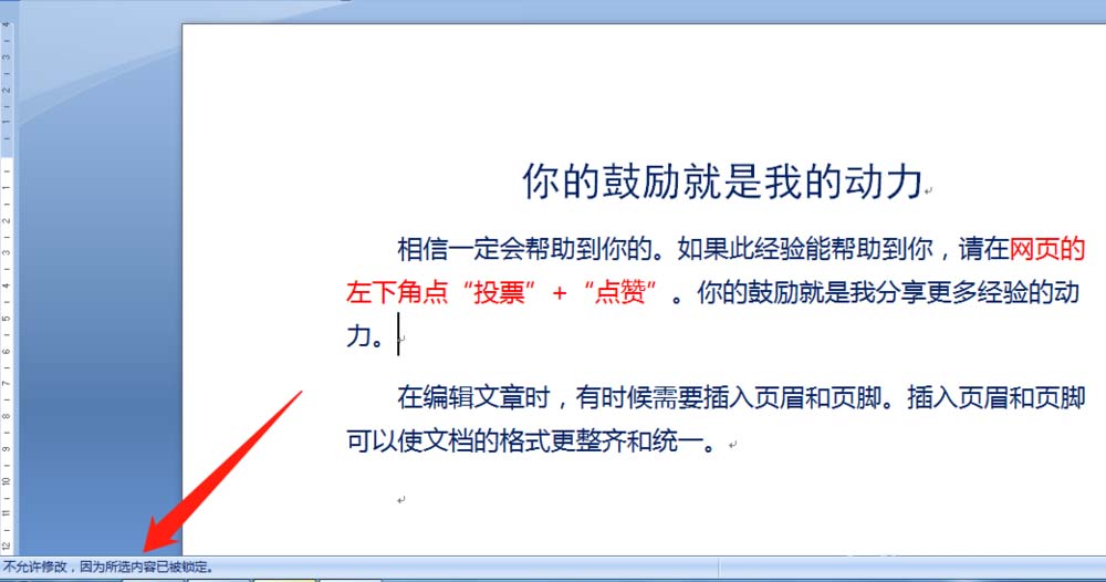 6、再次打开文档要进行编辑时,文档左下角提示"不允许修改,因为所选内容已被锁定。",无法进行编辑。