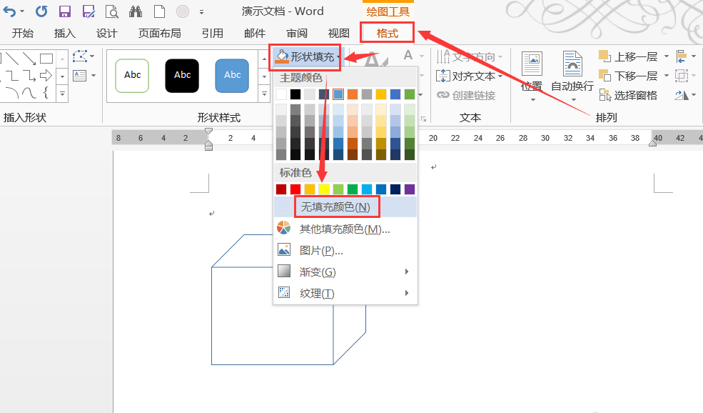5、切换到绘图工具"格式",在下面找到"形状填充",去掉图形中填充的颜色。
