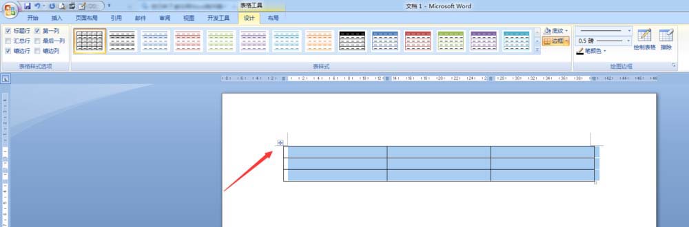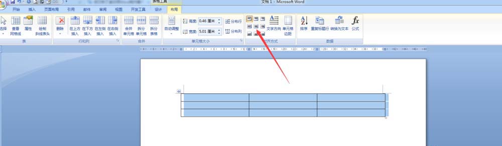 2、选中表格左上角的按钮,在【表格工具】-【布局】选项卡中将文字的对齐方式设置为水平居中.