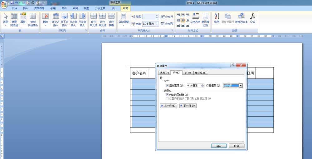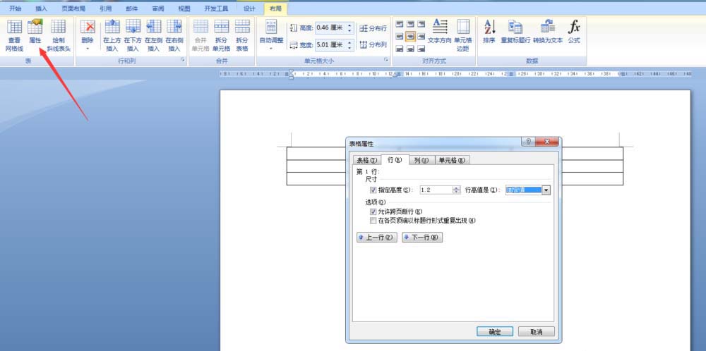 3、将光标定位到表格的第一行,打开【表格属性】对话框,将其行高设置为【1.2厘米】。