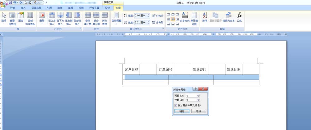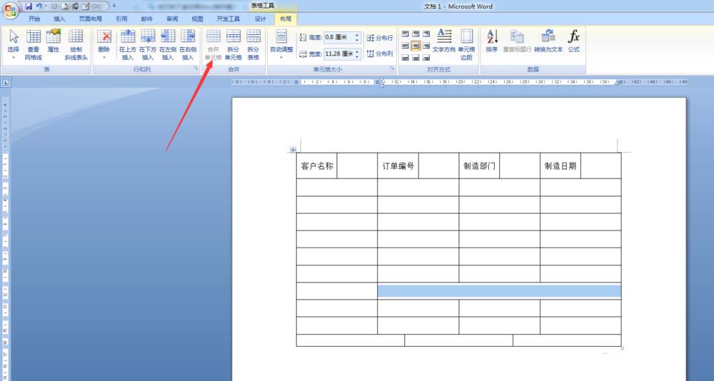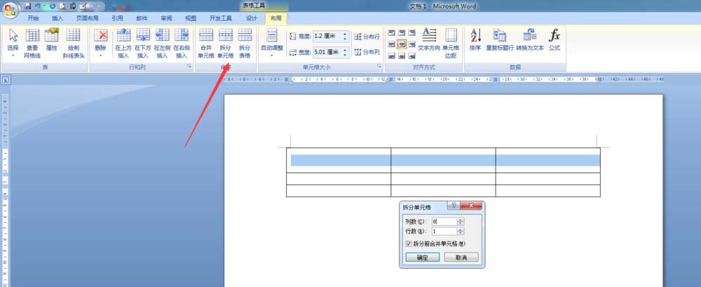 4、还是将光标定位到表格的第一行,选择【表格工具】-【布局】选项卡中的【拆分单元格】命令,然后将第一部分拆分成一行8列的单元格。