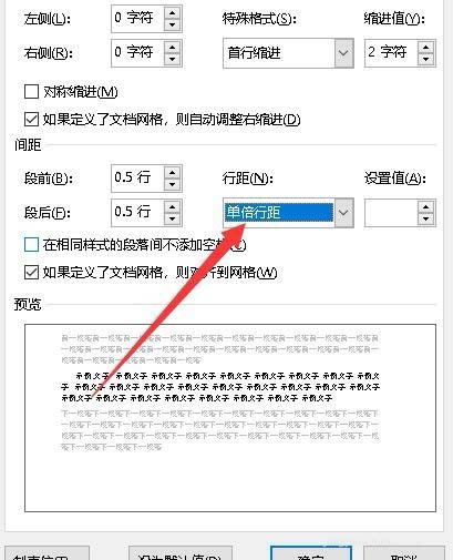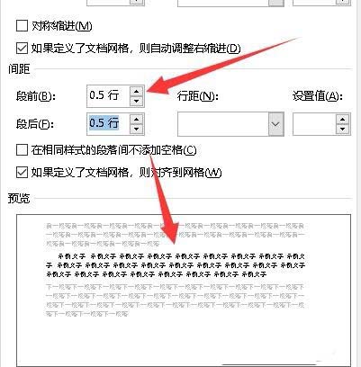 5、接下来再设置段落间距,一般设置段前与段后间距即可,设置为0.5行,可以通过下面的预览窗口看一下当前的效果。