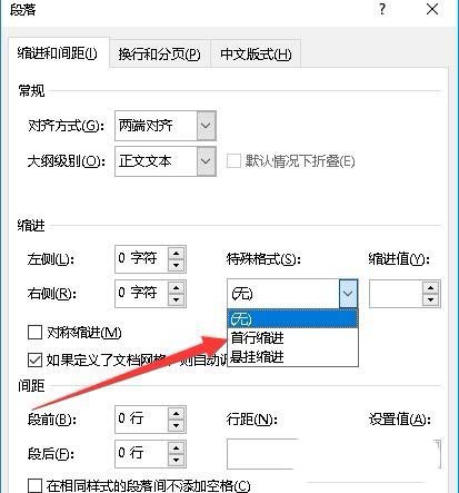 3、在打开的段落窗口中,我们点击"特殊格式"下拉按钮,在弹出菜单中选择"首行缩进"菜单项。