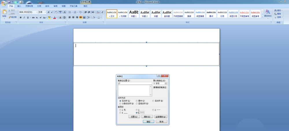 2、进入「开始」-「段落」-「段落设置」-「制表位」,在位置中输入"27",然后选择一种前导符,确定