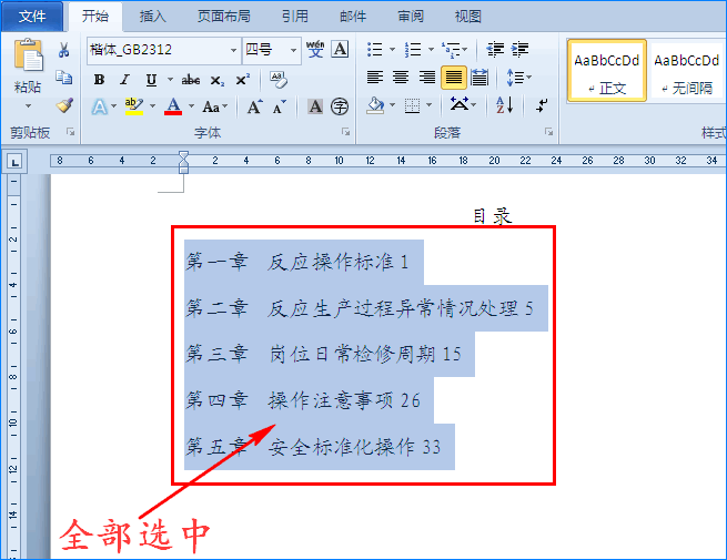 1、打开Word文档,先在文档中输入目录的内容和页码数,接着我们将内容和页码数全部选中。如图所示: