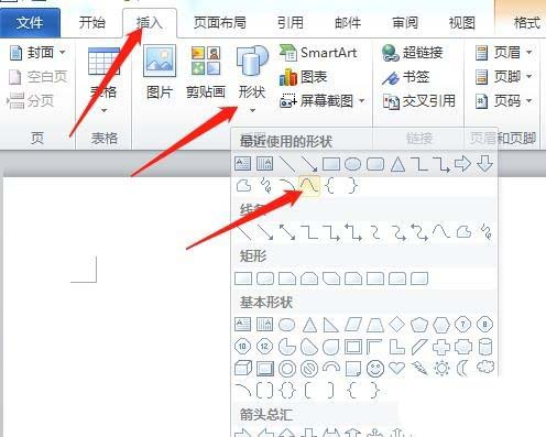 4、再点击插入选项卡,形状功能里的曲线。如图,在红箭头所示按顺序点出三个点,绘制出曲线。