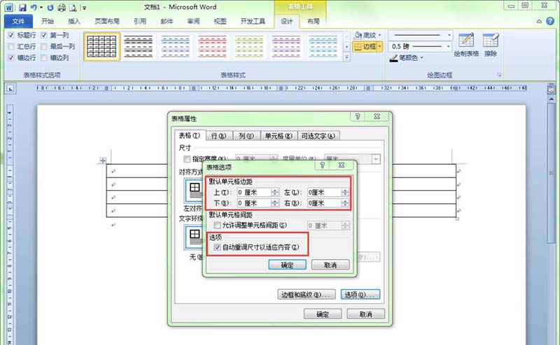 4、在弹出的"表格选项"对话框中,将单元格的边距全部设置为"0厘米"。把选项中"自动重调尺寸以适应内容"前面的勾去掉,这样当向单元格中插入图片时,图片就不会把单元格撑得太大了。