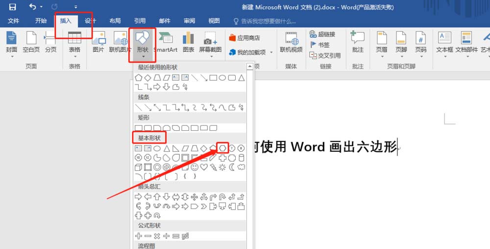 4、然后选择【基本形状】中的【六边形】