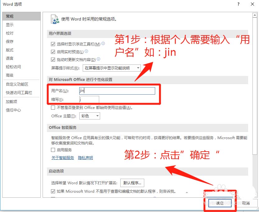 4、在"Word选项"的常规子窗口,根据个人需要输入用户名和缩写,并点击" 确定"选项。