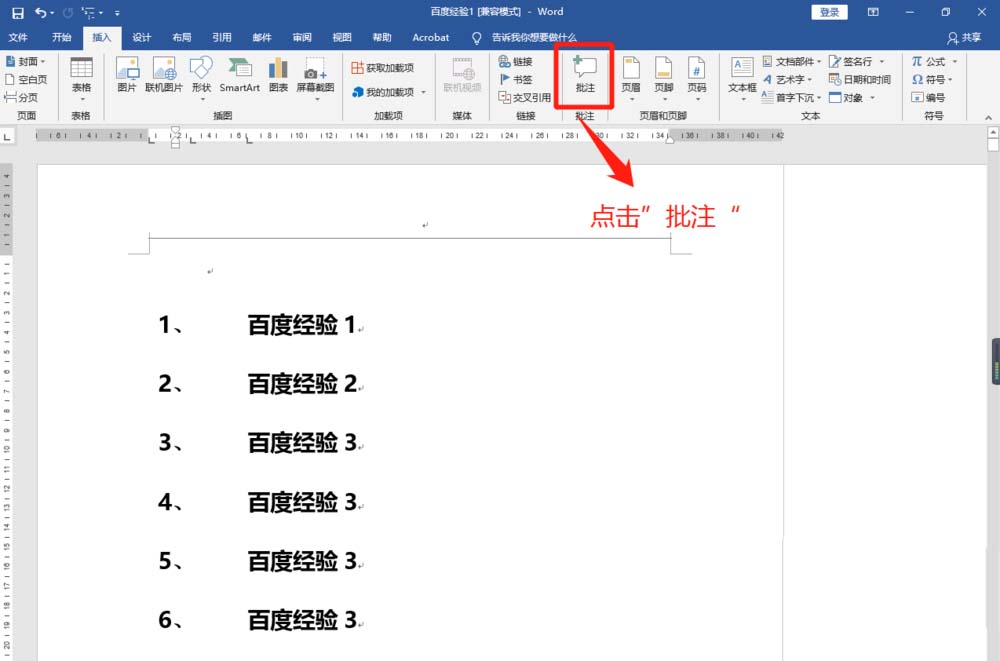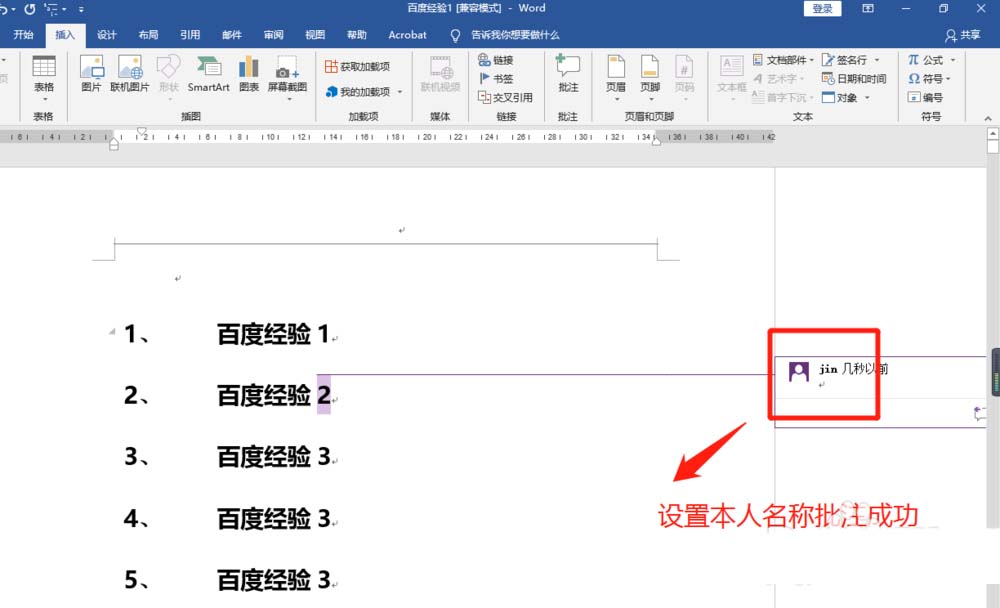 5、Word2016设置本人名字批注完成后,在文档"插入"菜单子窗口,点击"批注"查看设置效果。